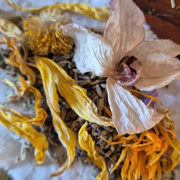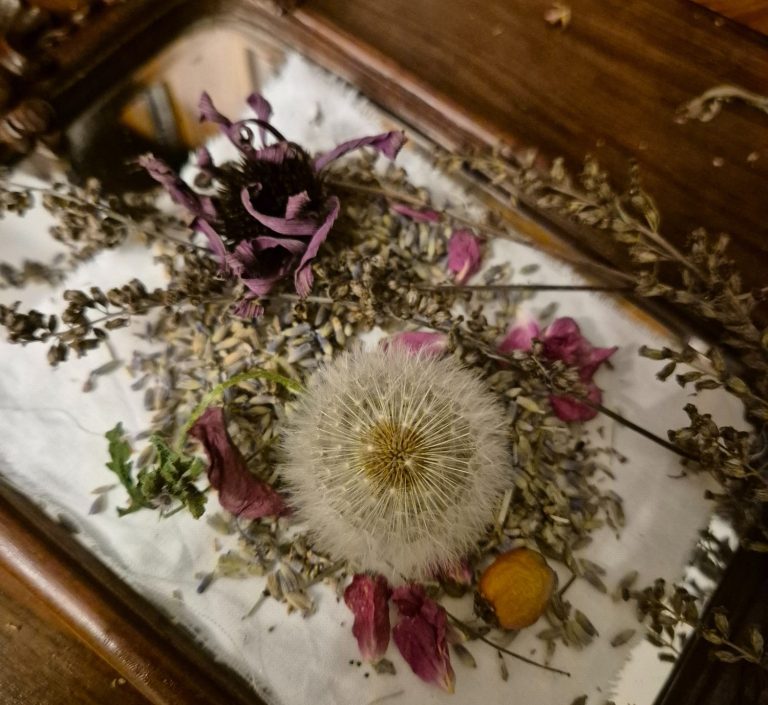 När jag fått klartecken från dig så börjar jag alltid med att plocka med materialet och med örterna. Här känner jag in vilken energi som ska lockas och följas.